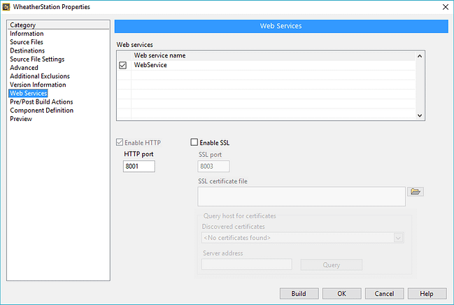 Pour déployer un service Web en source, il suffit de faire un clic droit sur ce dernier et de choisir Démarrer. Cependant, il semble y avoir un problème avec LINX: quelques fois, il y a une erreur au déploiement (LabVIEW ne trouve pas le serveur web et échoue à démarrer l’application). Du coup, je préfère tester mes services Web directement en compilant mon application. Pour cela, il convient de modifier les spécifications de construction de l’application: