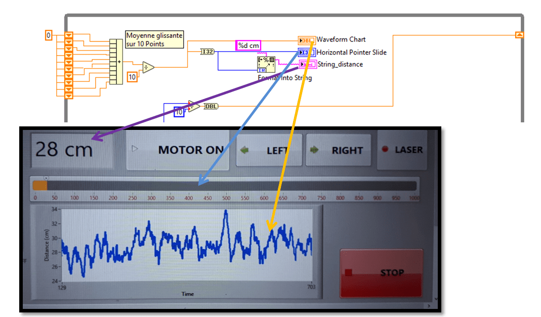 La valeur en sortie du VI n’est pas en cm mais en largeur d’une impulsion (µs), qui est proportionnelle à la distance mesurée en cm par le lidar. Afin de lire et d’afficher une valeur en cm, il faut diviser les valeurs en sortie du VI par une constante valant 10 pour obtenir une mesure de longueur (en cm). Cette constante est la sensibilité (en µs/cm) du capteur abordé précédemment que l’on peut retrouver dans la documentation du Lidar Lite V3 (page 4, §Mode Pin Control).