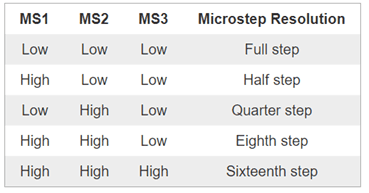 Les entrées MS1, MS2 et MS3 permettent de réduire le Pas, c’est-à-dire de gagner en précision angulaire. Le tableau ci-dessous affiche les niveaux à utiliser sur les pins en fonctions de la résolution du pas.