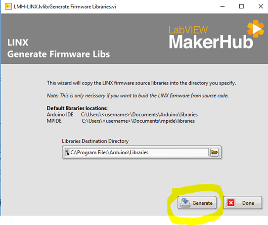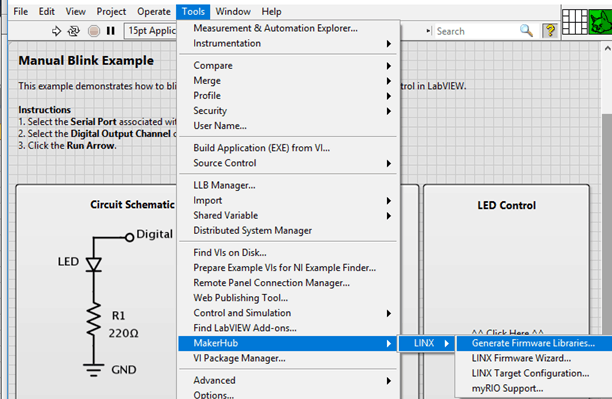 Avant de compiler le code, il faut charger les bibliothèques. Pour charger les bibliothèques, aller sur l’onglet Tool\MakerHub\LINX\Generate Firmware Librairies :