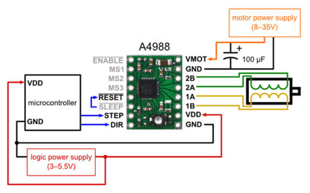 Le moteur Pas à Pas bipolaire est contrôlé par un Driver Pololu (A4988). Le schéma ci-après (d’après le site Pololu qui commercialise le Driver) permet de connecter le moteur et le Driver. La puce du Driver est alimentée en 5 V par la carte Arduino du LattePanda. Ce driver a été choisi car il est facilement pilotable à partir des E/S digitales du Arduino, qui seront contrôlées par le logiciel ; lequel qui sera abordé après.
