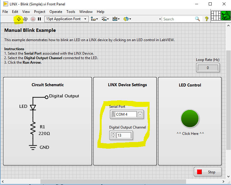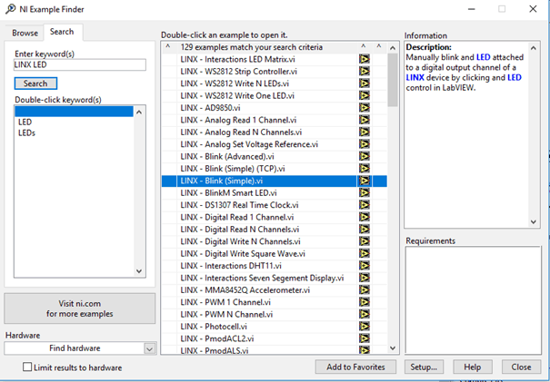 Des briques (ou VI) de code LabVIEW ont été développées afin de faciliter grandement la compatibilité entre des cartes Arduino et LabVIEW. Pour utiliser les briques de codes LINX, la bibliothèque LINX côté LabVIEW doit avoir été installée préalablement dans VI Pack Manager (logiciel qui permet de charger des ToolKit ou librairies de programme).