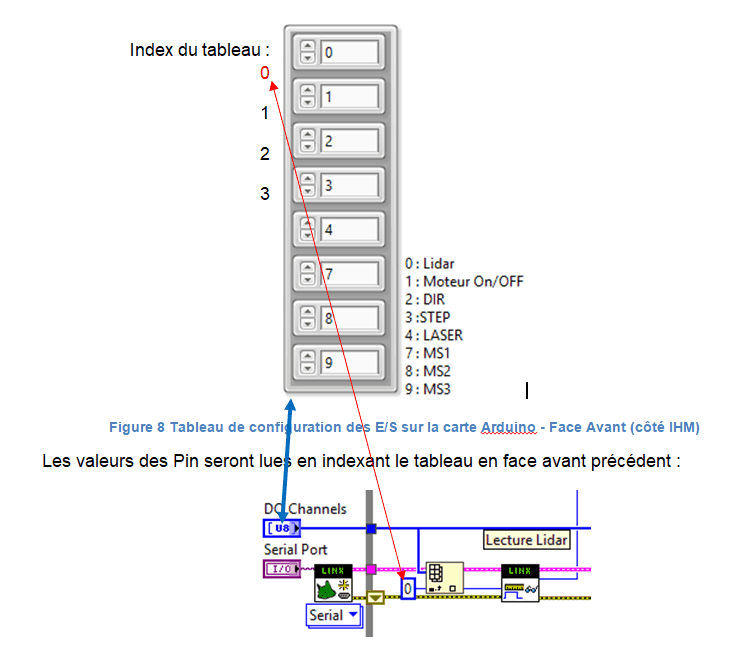 Pour piloter les instruments (Lidar, moteur, laser) le logiciel LabVIEW 2014 est utilisé. Le but n’est pas de faire la présentation ni la promotion de ce logiciel mais de tenter d’expliquer comment utiliser certaines briques LINX. Si LabVIEW n’est pas utilisé, il sera quand même possible de piloter les instruments via un programme développé sur l’IDE Arduino. La suite de l’article pourra paraître obscure pour les personnes non initiées à LabVIEW; je m’en excuse par avance. Cependant, un petit effort a été fait pour que le code soit compris des personnes non initiées à LabVIEW.