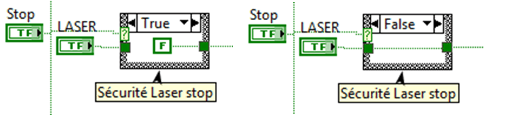 - La quatrième entrée active le laser. Un laser de visée peut fonctionner qu’avec une tension de 5V et ne consomme que quelques milliampères. Il est souhaitable pour la sécurité des personnes, que le bouton « STOP » qui arrête le programme, puisse stopper l’émission du laser à la fin de la manip en même temps. Pour cela on pourra mettre une boucle conditions comme ci-dessous :